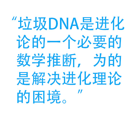 J•B•S•霍尔丹(1957年,霍尔丹)5和其他人的研究工作表明,在人类进化的时间范围内,自然选择不可能选择出数百万的新突变。鉴此,木村(1968年)6提出了“中性进化”的想法,因为如果“霍尔丹的困境”7是正确的话,大多数DNA必须是没有功能的。DNA应该是随着时间的推移自由地变异而无需接受自然选择。这样,自然选择就可以作用于重要的元件,其他部分任由中性进化去随机运作。既然自然选择不能作用于那些不影响生存和繁殖的中性特征,中性进化就可以通过没有内在“选择代价”的随机漂移而进行。8“垃圾DNA”一词起源于大野(1972年),9他这个概念完全基于中性进化的想法。对于大野和其他同时代的科学家来说,蛋白编码基因之间的巨大空间是无用的DNA,其唯一功能是在染色体中分隔基因。现在你明白垃圾DNA的这一概念的由来了吗?它是数学上的必然推论,它的发明是为了解决进化理论的一个困境。如果没有“垃圾DNA”理论,进化就会陷入无法克服的数学困境中。