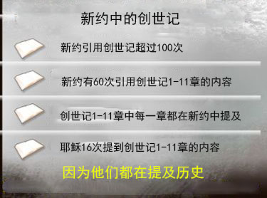 再者,创世记并不是脱离“真正教导”的旁枝末节。新约圣经的作者在建构教会的教义时提到创世记第1章,他们的文化背景又如何呢?新约圣经中有超过100次提到创世记,其中提到创世记第1-11章的次数有60次,每一位新约圣经的作者都提到了创世记第1-11章(见图)。