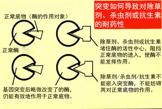 除草剂通常需要嵌入相应的酶中才能发挥作用——有点像钥匙插入锁中。如果酶这把锁上插了一把错误的钥匙--除草剂,那么正确的钥匙--正常的化学底物,就不能与酶结合,(译注:也就不能进行正常的生命活动),从而导致植物--草的死亡。(如图所示)。如果编码这种酶的基因发生突变,酶的结构也就发生细微的变化,导致除草剂分子不能再与之结合,这样,植物就获得除草剂抗性。改变后的酶足以发挥常规的作用而确保植物存活,但是它不能再像以前那样有效地发挥正常的作用,从而导致植物在没有除草剂的野外环境里存活的适应能力下降。