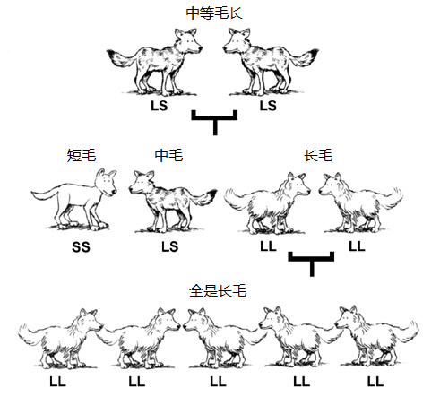 从第一排开始,中等毛长的动物(LS)交配繁殖,后代中的每只动物从每个亲体中都可能获得L或S,形成自己的一对基因。在第二排中,我们看到后代可能有短毛(SS)、中毛(LS)或长毛(LL)。试想像,如果气候大幅度变冷(像大洪水后的冰川期),只有长毛动物得以存活并留下后代(第三排)。从此以后,所有的犬都变成长毛品种了。请注意:
