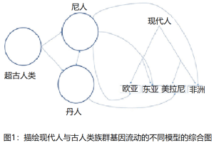 要确定古人类族群是否曾与现代人婚配,我们需要一份他们的基因组拷贝。如此,若在现代人基因组中找到些“古”基因,便能确认他们曾经有过婚配。但科学家只有尼人与丹人的基因组序列,而其他古人类基因组序列则空缺,于是只能通过统计学模型来推导现代人中的古DNA。这些模型的结论比简单对照两个人的基因组更不确切。事实上,其中有相当程度的猜测性。图1描绘了现代人、尼人、丹人、以及超古人类间的基因流动模型。