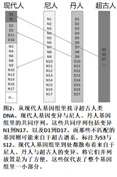 当研究者发现尼人与丹人缺乏一些现代人基因组的变异类型时,便就此推导出部分现代人的DNA来自于超古谱系(见图2)。由于使用了所谓“走出非洲模型”作为基因渗入的时间标志,他们也必须比较非洲人与其它人。因此德瓦苏拉(Durvasula)与圣可拉拉曼(Sankararaman)便比较了撒哈拉以南地区的四个族群与尼人、丹人的基因组。结果显示这些人类族群基因组里大约有2%到19%的基因序列来自于尼人与丹人之前的人类谱系,其中包括了一些具有肿瘤抑制与内分泌调节作用的基因[11]。做出这个结论的依据是这些变异并没在尼人、丹人身上发现。不过,他们是想当然地早已假定在这之前还存在一个人类族群。但亦有可能尼人其实遗传了部分大洪水之后的早期人类族群的变异,而非洲人却没有;或者相反。