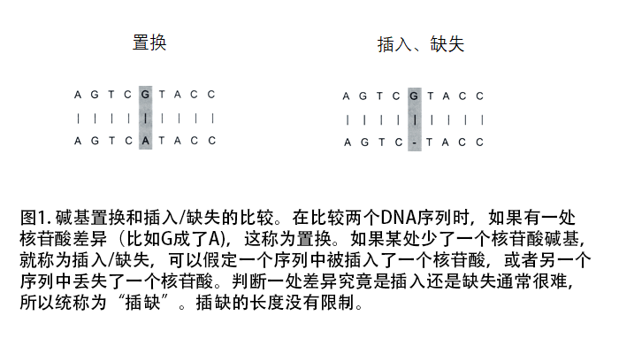此外,百分比的使用掩盖了差异的规模。例如, 1.23%的差异属于单碱基对置换。这听起来并不多,直到您意识到它代表了大约 3500 万个突变!但这只是开始,在人类基因组中还有黑猩猩所没有的大约 4000-4500 万个碱基对,而黑猩猩的基因组中也有类似数目的碱基是人类所没有的。这些额外的 DNA 核苷酸被称为“插入”或“缺失”,因为它们被认为是在序列中添加或丢失的(关于置换和插入的比较见图1)。这使得 DNA 差异的总数达到了 1.25 亿。然而,由于每次插入的核苷酸可能不止一个,人类和黑猩猩的基因组之间大约需要4000 万个独立的突变事件。