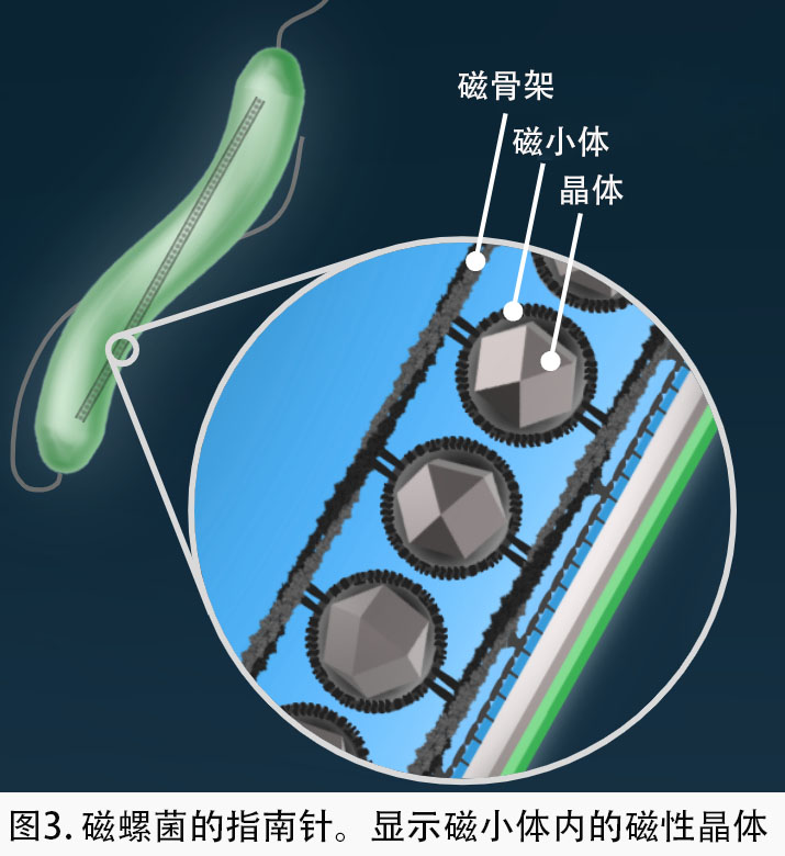 最后,晶体被组装成一根或多根指南针(图 3)。 细长的电缆状纤维从细胞的一端延伸到另一端,形成一种“复杂的机械支架”[5], 称为磁骨架。更多的机器协调作业,使磁小体附着在磁骨架上并沿着磁骨架移动,形成晶体长链。 磁骨架必须具有坚固的设计,以防止指南针由于晶体之间的磁引力而弯曲折叠。 指南针在造完之后成为“极其高效的磁传感器”[4]。