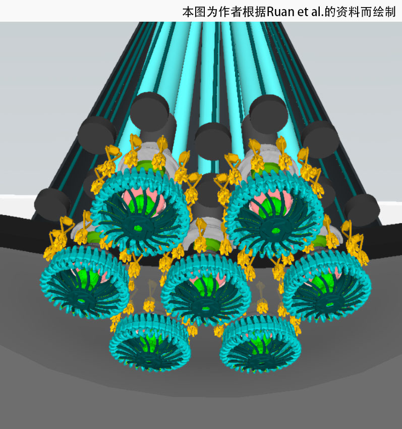 趋磁细菌利用复杂的电动机来游泳,电动机驱动着鞭毛的旋转,好像长长的螺旋桨。 这些电机具有许多部件,与人类设计的电机中的部件执行着类似的功能。其中包括齿轮、转子、轮轴、驱动杆、衬套、滚珠轴承、类油(脂)润滑剂、结构支架、铰链、万向节、其他接头类型、适配环、开关、定子、电容器和传感器[1]。 一个趋磁物种拥有生物界最复杂、最强大的引擎之一,如下图所示。 该引擎由多个协调电机组成[2], 使细菌能够以每秒超过 200 个身体长度的速度游泳[3]。 就像指南针一样,这些电动机及其工厂式的程序生产线对于那种认为它们仅仅起源于非智能物质的想法构成了巨大的障碍。