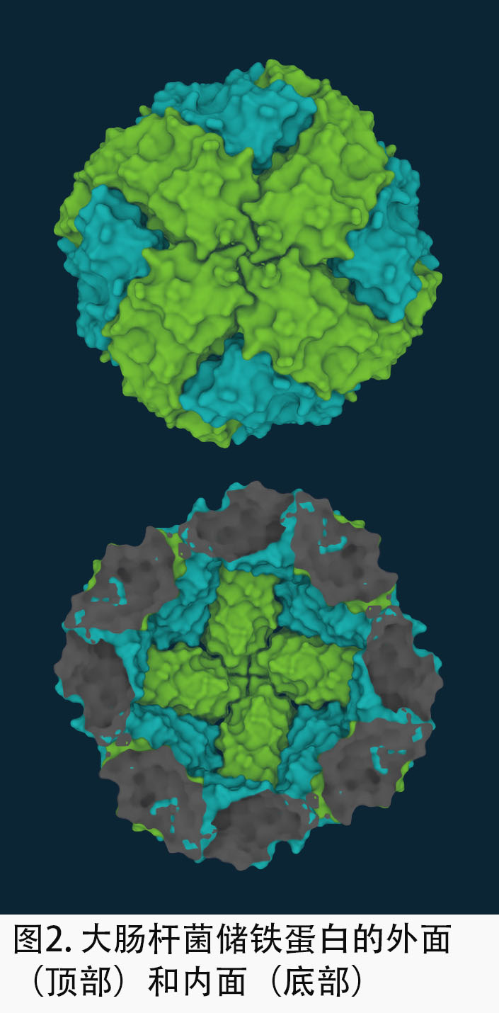 细胞从周围环境中收集铁,通过由感受器和分子机器构成的复杂系统将其吸入,其中包括为铁元素转运机器提供动力的微型电动机。 铁元素进入细胞之后必须被小心地处理,因为它是有毒的。 细菌有复杂的、高度受控的系统来管理这种风险。 细菌细胞将铁储存在特殊的蛋白质容器中,直等到需要的时候(图 2)。 在将铁元素装入储存容器之前,必须有机器将其进行化学改造。