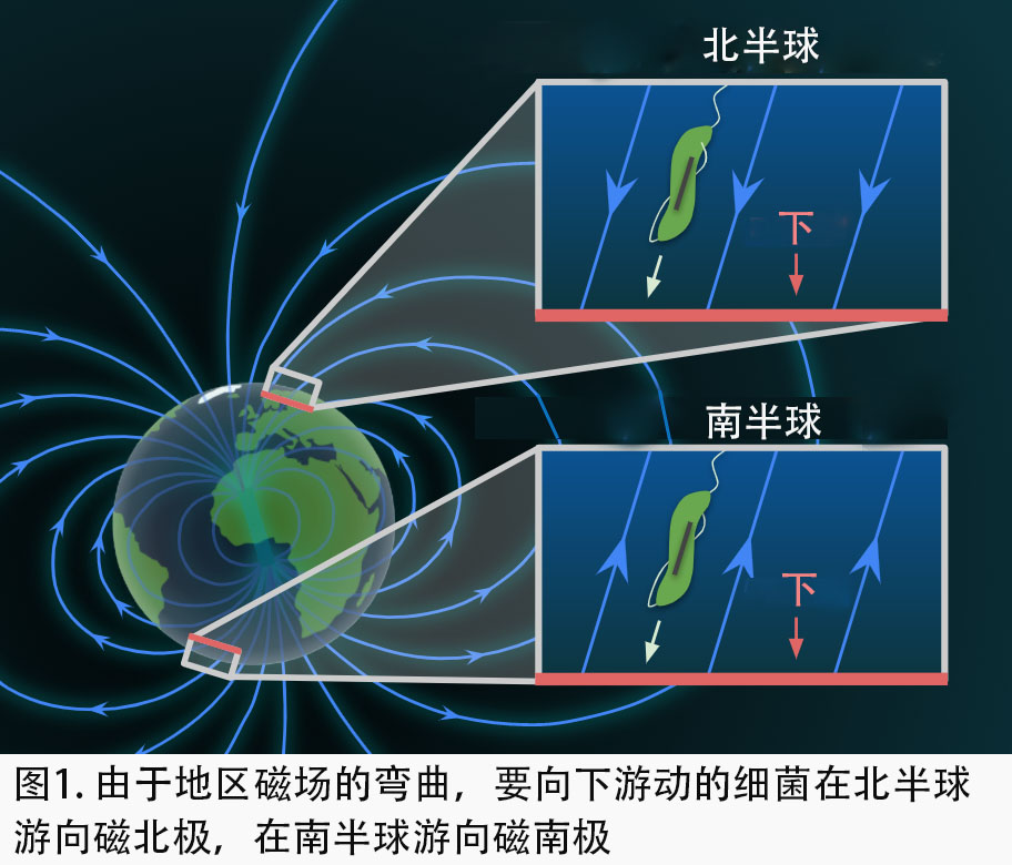 大家都知道磁力线从地球的磁南极传播到磁北极,然而磁力线也是在南半球从地球表面向上升起,并在北半球弯曲向下回到地球(图 1)。 因此,想要向下移动的细菌在北半球就向磁北移动,在南半球就向磁南移动。 如果这些细菌在南北半球之间被转移,它们很快就会发现向下的方向与磁场方向的关系发生了逆转。借此细菌便可以快速地找到最佳生长条件,因为它们只沿着磁力线上下移动,而不是随机的三维游动。