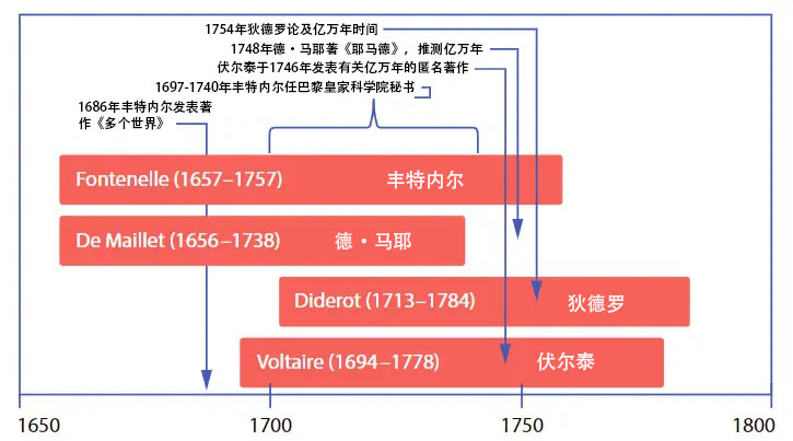 早期的欧洲科学家,如尼古拉斯·斯蒂诺(Nicolaus Steno,1638-1686),一直信赖圣经,并在大洪水的记载与地质学证据间发现一致性[1]。而法国思想界对于漫长时间概念的发展涉及许多因素。遵循勒内·笛卡尔(René Descartes,1596-1650)的怀疑论和质疑方法,《圣经》中关于创造和大洪水的记载在科学中被剥夺了一席之地,而堕落的人的想法成为了科学知识的仲裁者。